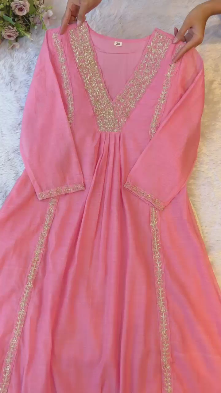 Delicate aari work runs gracefully along the neckline, sleeves, and panels, adding just the right touch of golden shimmer without going overboard. Designed for effortless elegance, this outfit flows beautifully — perfect for those festive brunches, pooja days, or when you just feel like being the prettiest person in the room 💕